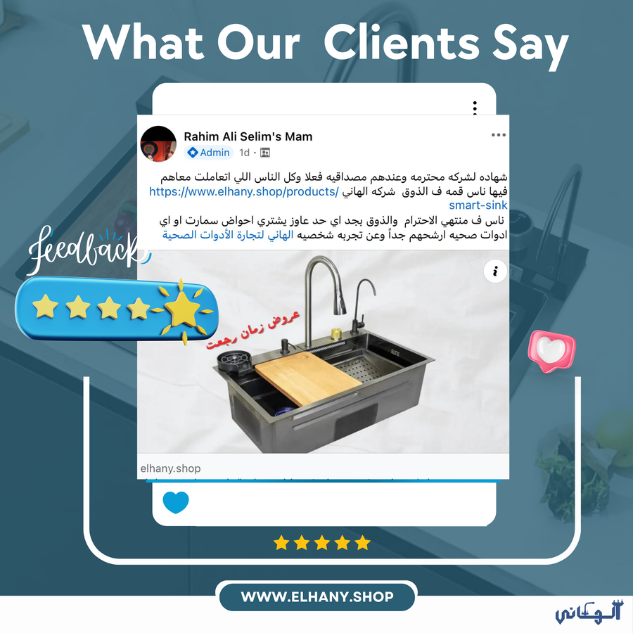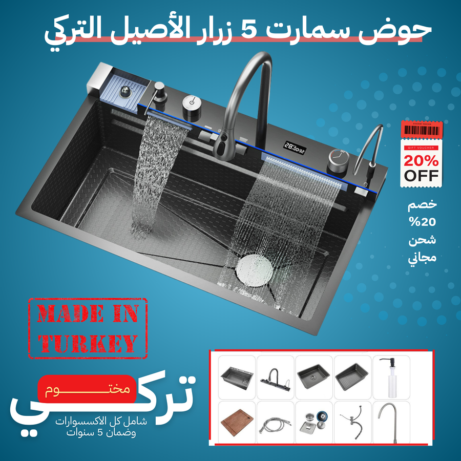 حوض مطبخ سمارت 5 زرار ديجيتال 75 × 45 سم لون اسود بالصرف و المشتملات